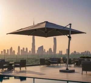 Consider the backdrop: a Dubai skyline background demands a sleek, modern cantilever umbrella that doesn’t obstruct the view. Using a neutral palette—such as sand, stone, or charcoal—allows the umbrella to blend seamlessly into the warm minimalism of contemporary UAE landscape design. This approach ensures your outdoor space looks like a professional shot on a Phase One XF camera.”